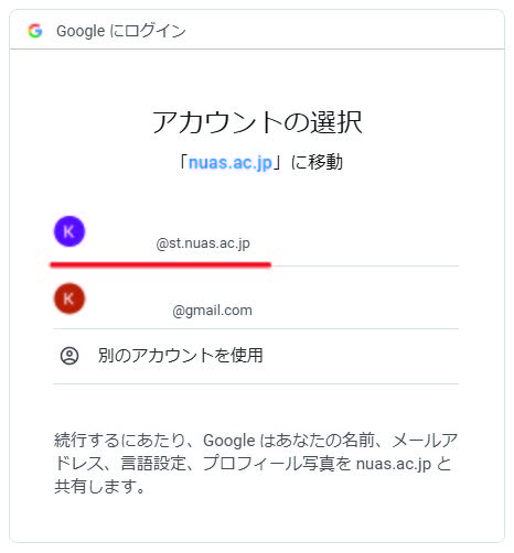 アカウントの選択画面が出た場合は、大学のGoogle アカウントを選択。